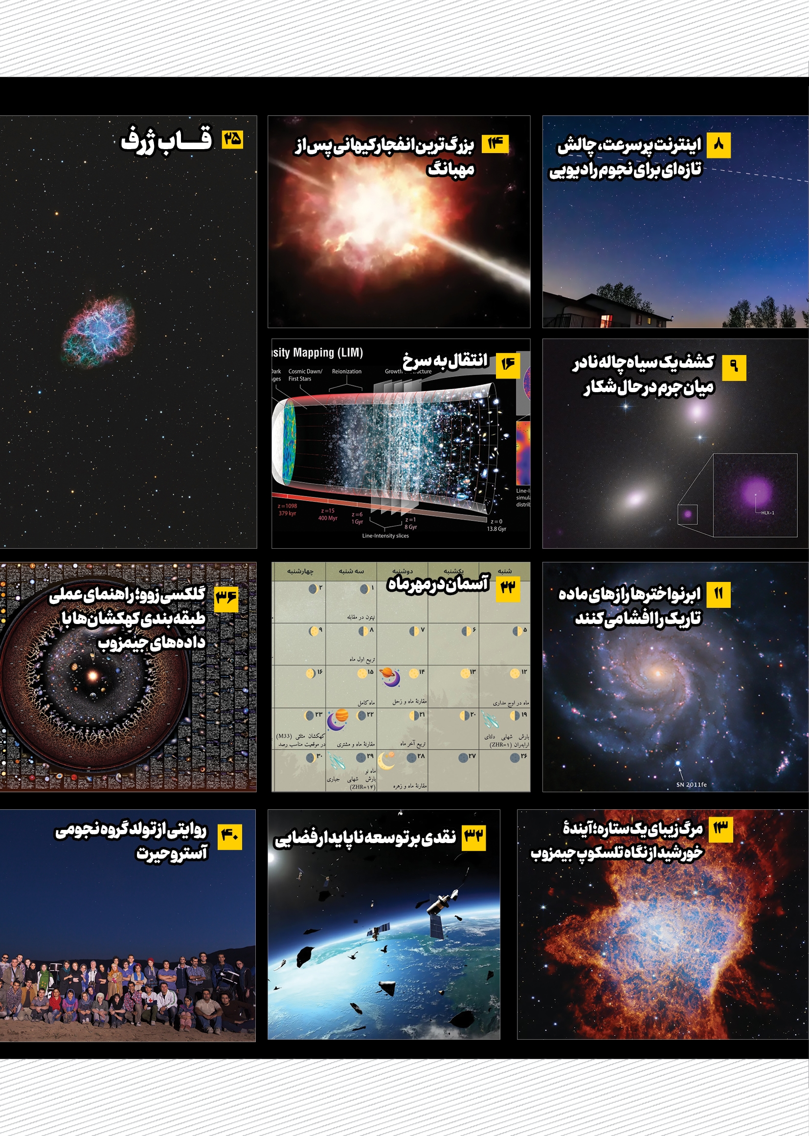تازهها با خبری از مهتاب نوشآبادی از چالشهای تازۀ نجوم رادیویی در برابر ماهوارههای استارلینک همراه است. در ادامه، فرازنه دودانگه در مقالهای علمی به موضوع «انتقال به سرخ» پرداخته است.